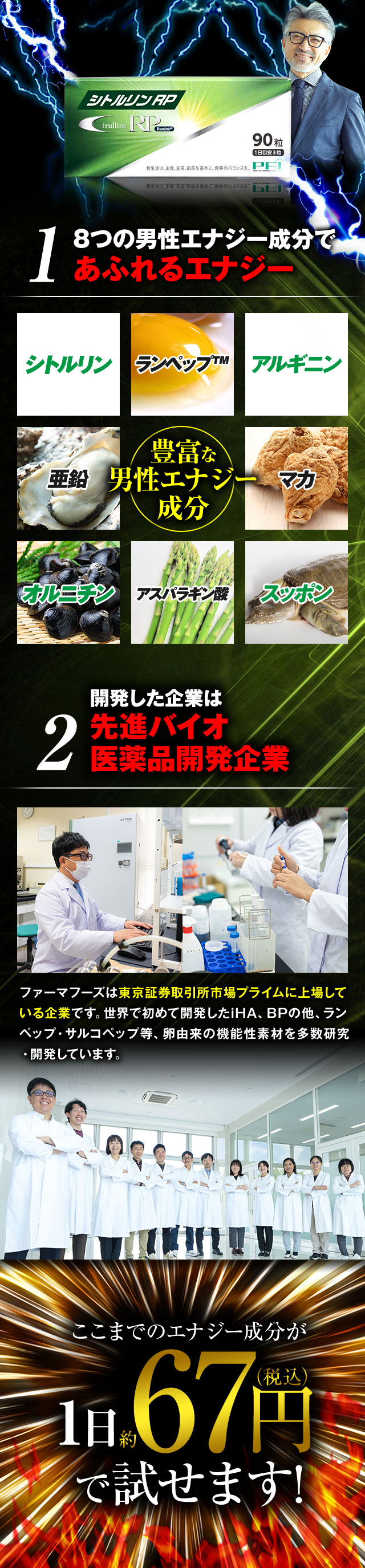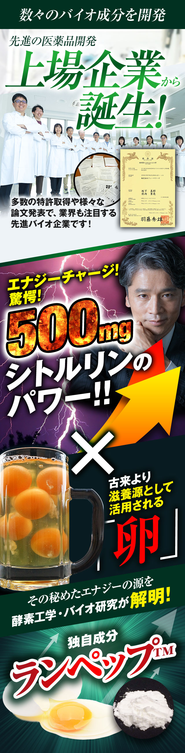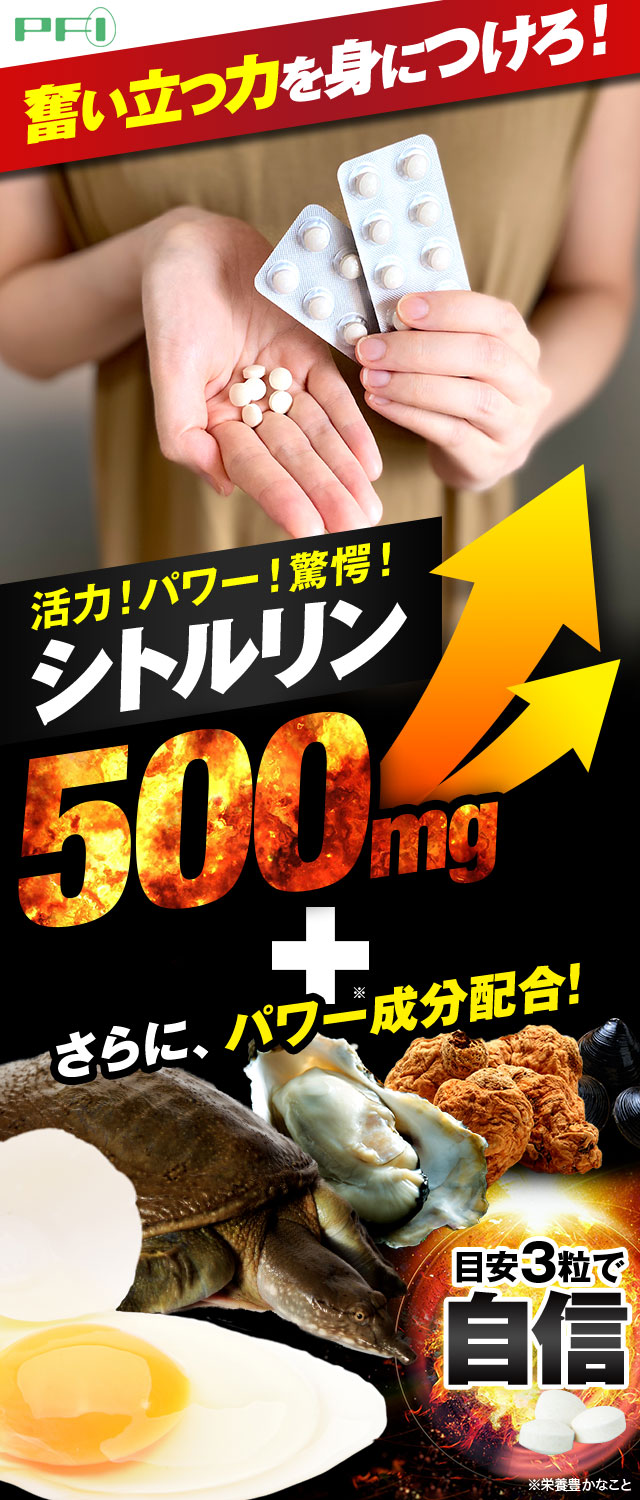 L-シトルリン(中国製造)、卵白加水分解物(卵を含む)、亜鉛酵母、マカ抽出物末、すっぽん粉末、オルニチン/結晶セルロース、クエン酸、ステアリン酸カルシウム、光沢剤、微粒酸化ケイ素、リン酸三カルシウム、グァーガム、L-アルギニン、L-アスパラギン酸ナトリウム