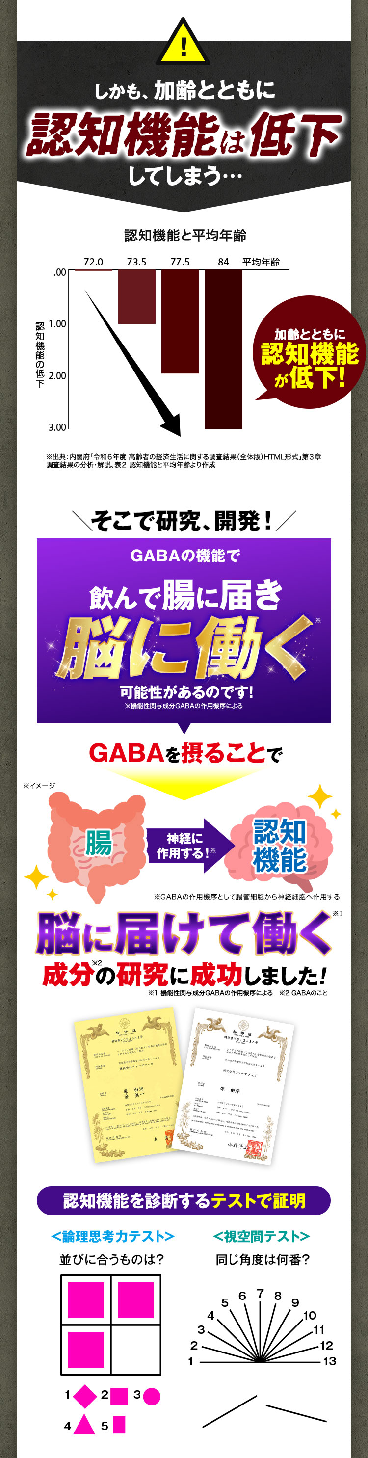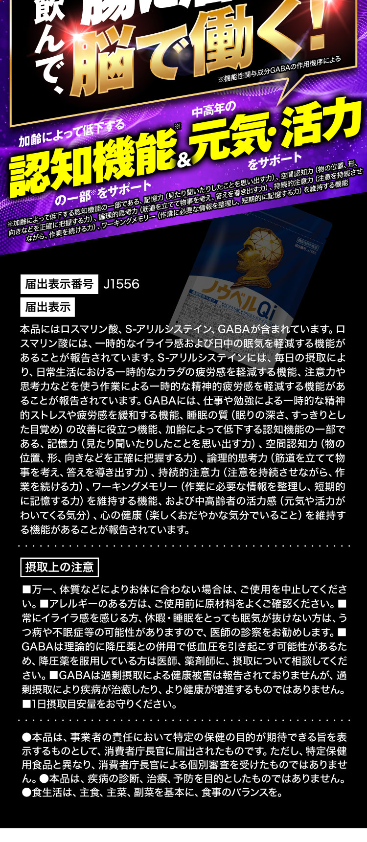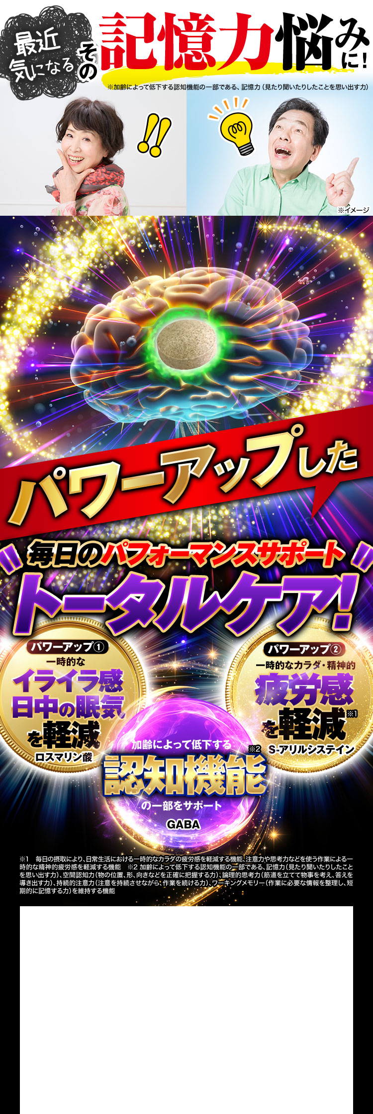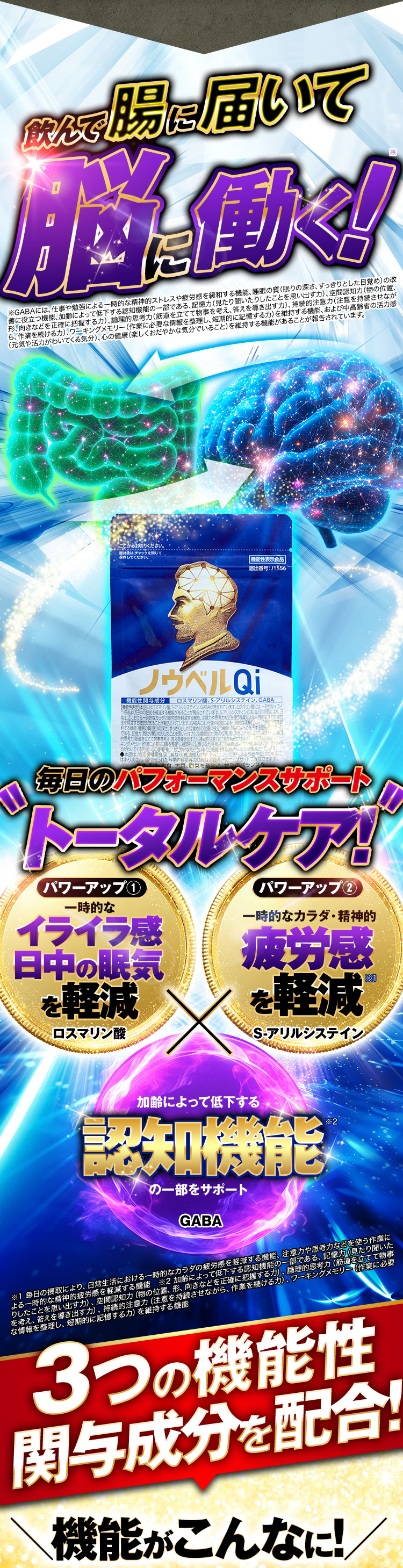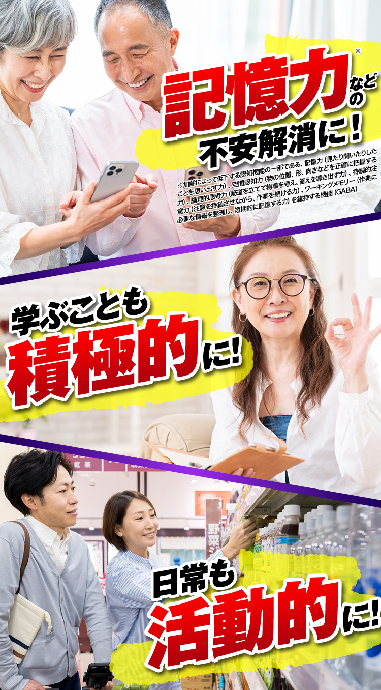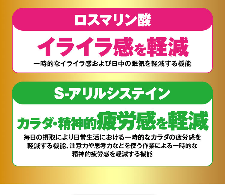 - 本品にはロスマリン酸、S-アリルシステイン、GABAが含まれています。ロスマリン酸には、一時的なイライラ感および日中の眠気を軽減する機能があることが報告されています。S-アリルシステインには、毎日の摂取により、日常生活における一時的なカラダの疲労感を軽減する機能、注意力や思考力などを使う作業による一時的な精神的疲労感を軽減する機能があることが報告されています。GABAには、仕事や勉強による一時的な精神的ストレスや疲労感を緩和する機能、睡眠の質(眠りの深さ、すっきりとした目覚め)の改善に役立つ機能、加齢によって低下する認知機能の一部である、記憶力(見たり聞いたりしたことを思い出す力)、空間認知力(物の位置、形、向きなどを正確に把握する力)、論理的思考力(筋道を立てて物事を考え、答えを導き出す力)、持続的注意力(注意を持続させながら、作業を続ける力)、ワーキングメモリー(作業に必要な情報を整理し、短期的に記憶する力)を維持する機能、および中高齢者の活力感(元気や活力がわいてくる気分)、心の健康(楽しくおだやかな気分でいること)を維持する機能があることが報告されています。
