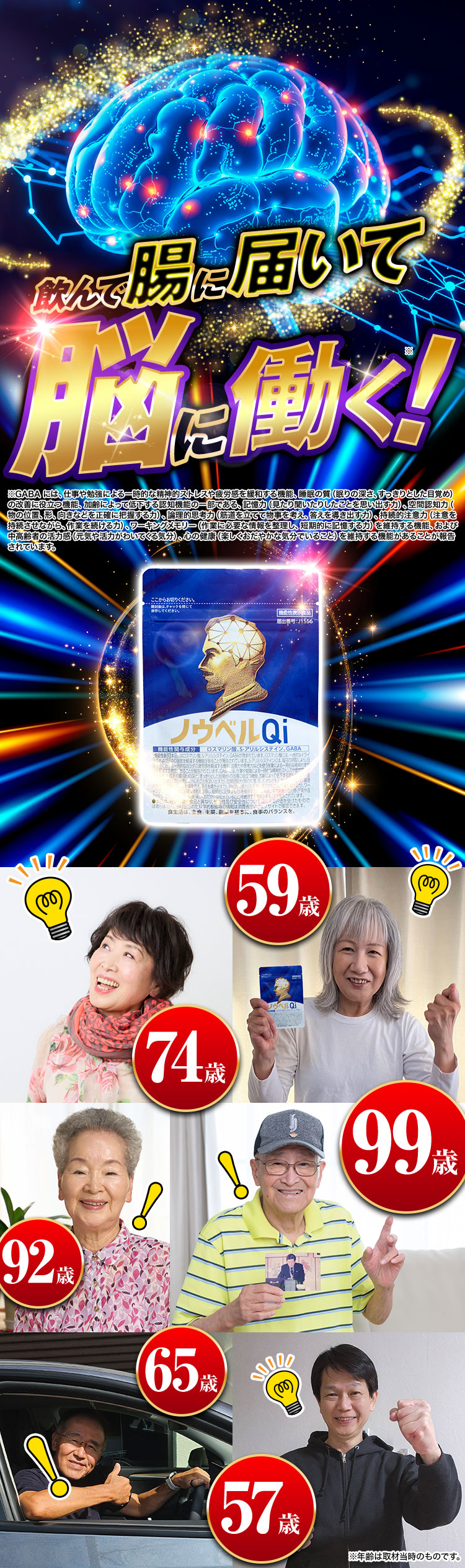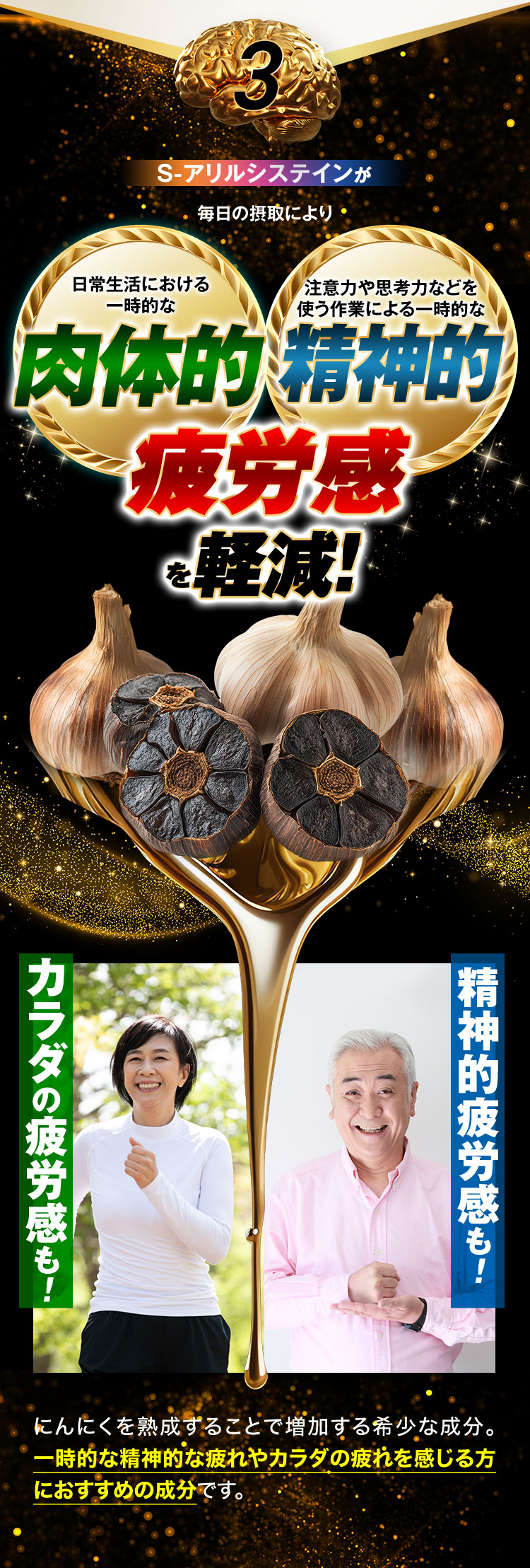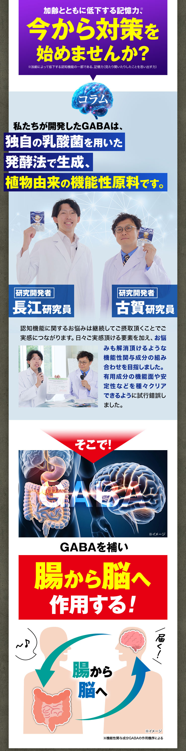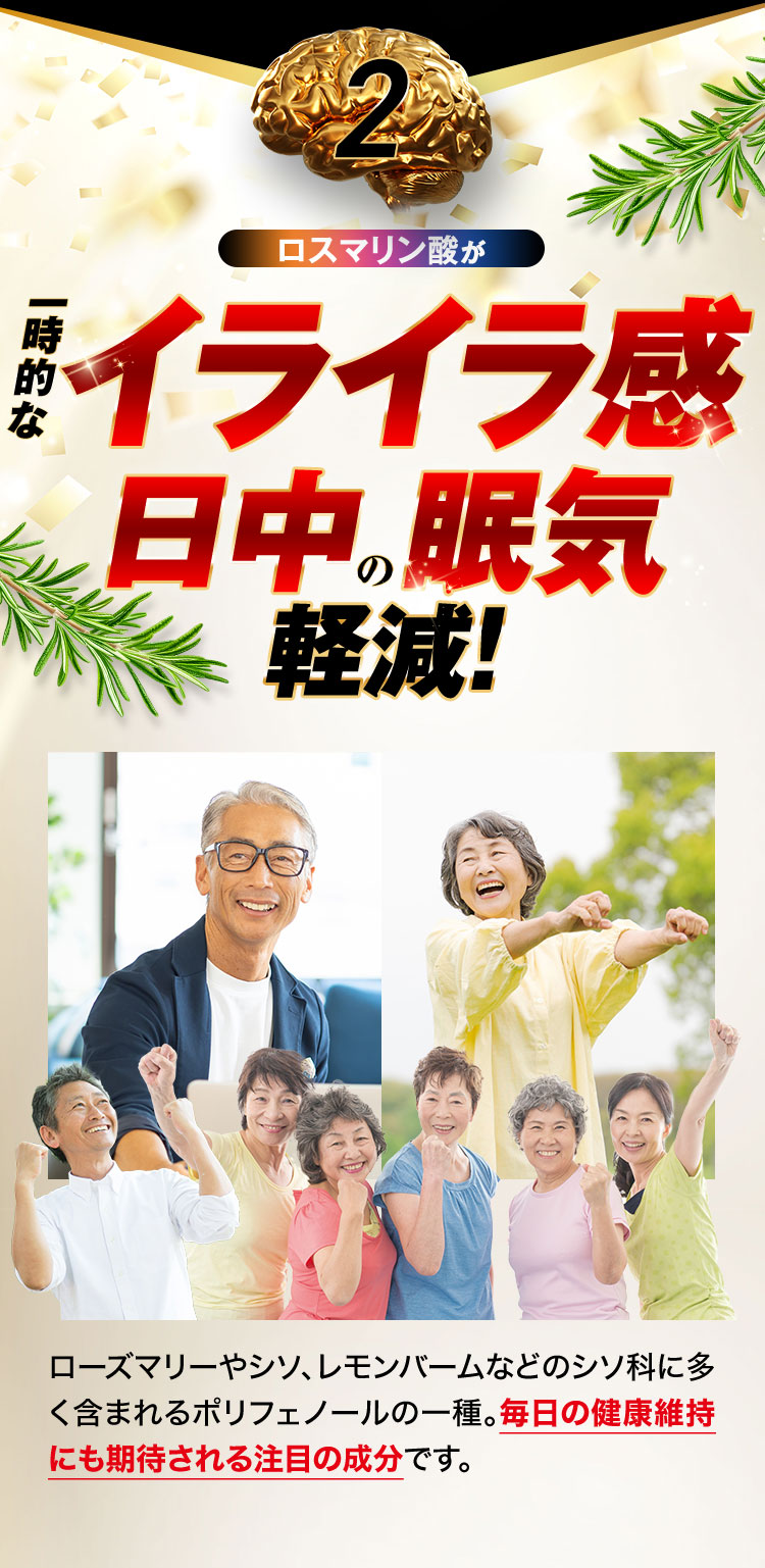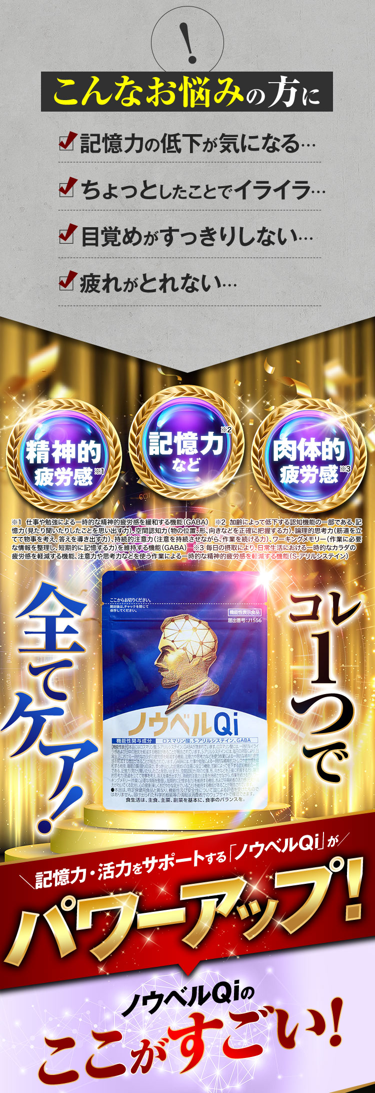 - 本品にはロスマリン酸、S-アリルシステイン、GABAが含まれています。ロスマリン酸には、一時的なイライラ感および日中の眠気を軽減する機能があることが報告されています。S-アリルシステインには、毎日の摂取により、日常生活における一時的なカラダの疲労感を軽減する機能、注意力や思考力などを使う作業による一時的な精神的疲労感を軽減する機能があることが報告されています。GABAには、仕事や勉強による一時的な精神的ストレスや疲労感を緩和する機能、睡眠の質(眠りの深さ、すっきりとした目覚め)の改善に役立つ機能、加齢によって低下する認知機能の一部である、記憶力(見たり聞いたりしたことを思い出す力)、空間認知力(物の位置、形、向きなどを正確に把握する力)、論理的思考力(筋道を立てて物事を考え、答えを導き出す力)、持続的注意力(注意を持続させながら、作業を続ける力)、ワーキングメモリー(作業に必要な情報を整理し、短期的に記憶する力)を維持する機能、および中高齢者の活力感(元気や活力がわいてくる気分)、心の健康(楽しくおだやかな気分でいること)を維持する機能があることが報告されています。