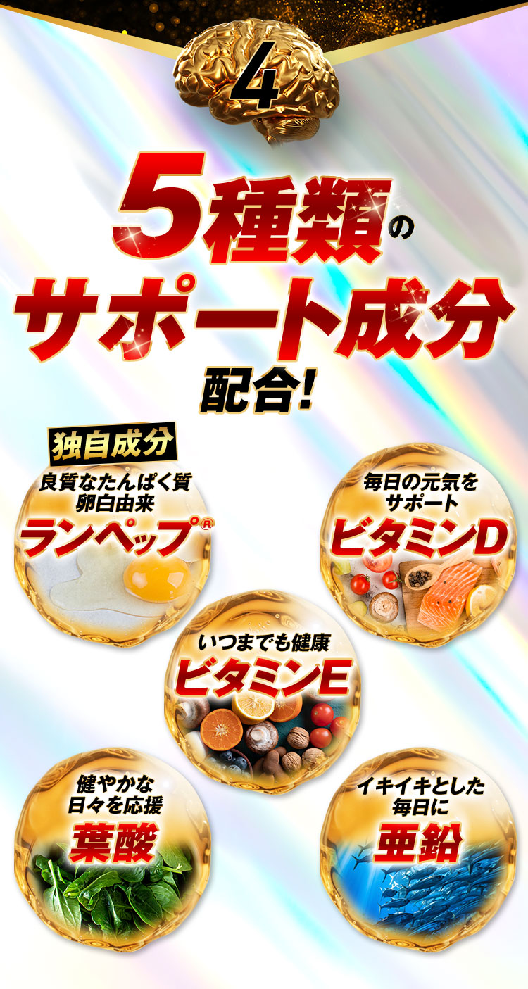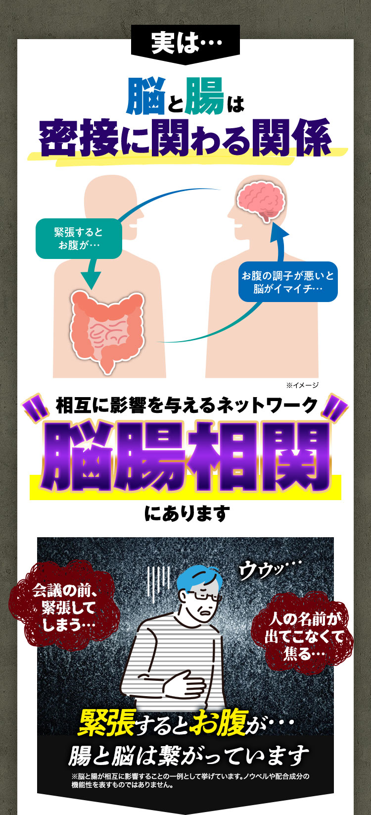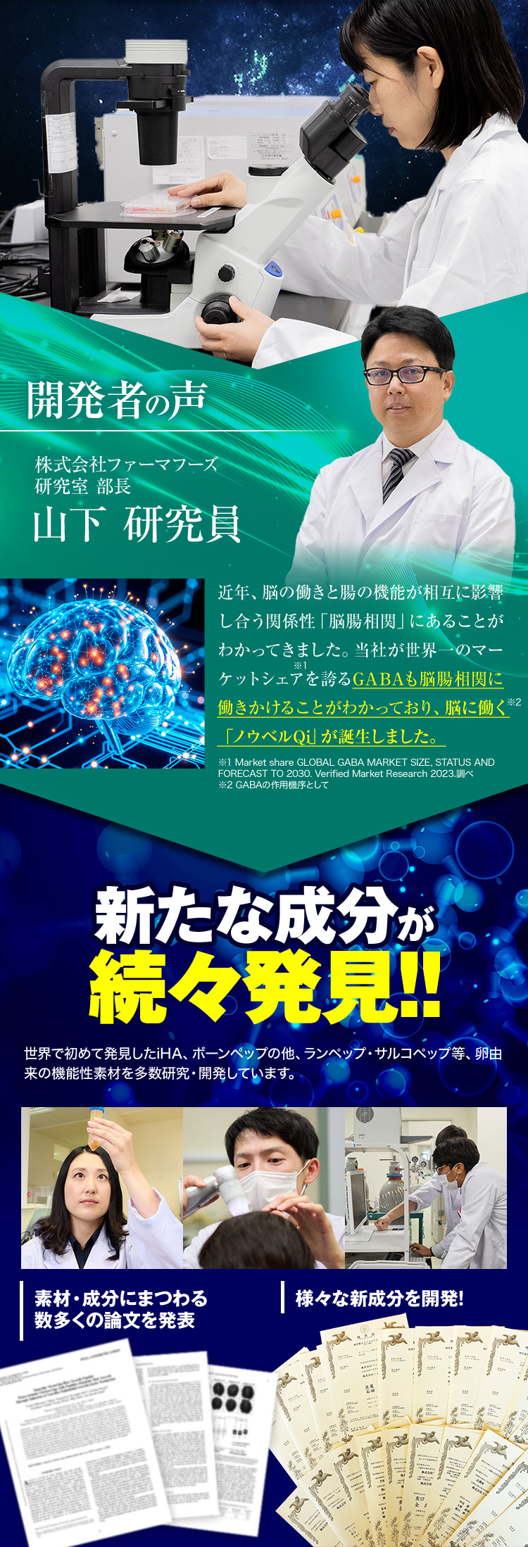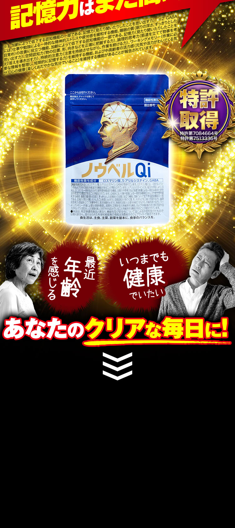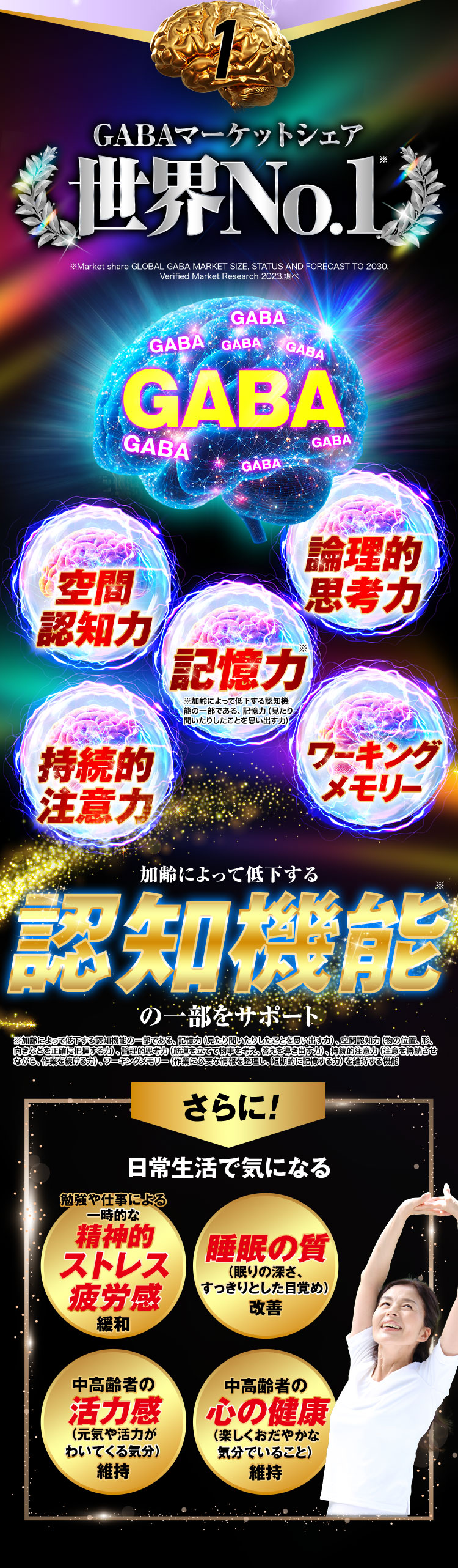 - 本品にはロスマリン酸、S-アリルシステイン、GABAが含まれています。ロスマリン酸には、一時的なイライラ感および日中の眠気を軽減する機能があることが報告されています。S-アリルシステインには、毎日の摂取により、日常生活における一時的なカラダの疲労感を軽減する機能、注意力や思考力などを使う作業による一時的な精神的疲労感を軽減する機能があることが報告されています。GABAには、仕事や勉強による一時的な精神的ストレスや疲労感を緩和する機能、睡眠の質(眠りの深さ、すっきりとした目覚め)の改善に役立つ機能、加齢によって低下する認知機能の一部である、記憶力(見たり聞いたりしたことを思い出す力)、空間認知力(物の位置、形、向きなどを正確に把握する力)、論理的思考力(筋道を立てて物事を考え、答えを導き出す力)、持続的注意力(注意を持続させながら、作業を続ける力)、ワーキングメモリー(作業に必要な情報を整理し、短期的に記憶する力)を維持する機能、および中高齢者の活力感(元気や活力がわいてくる気分)、心の健康(楽しくおだやかな気分でいること)を維持する機能があることが報告されています。