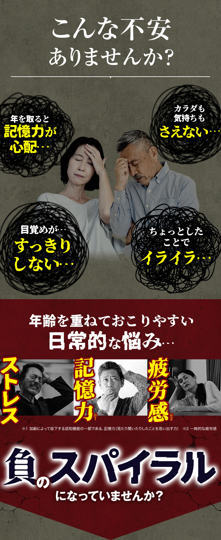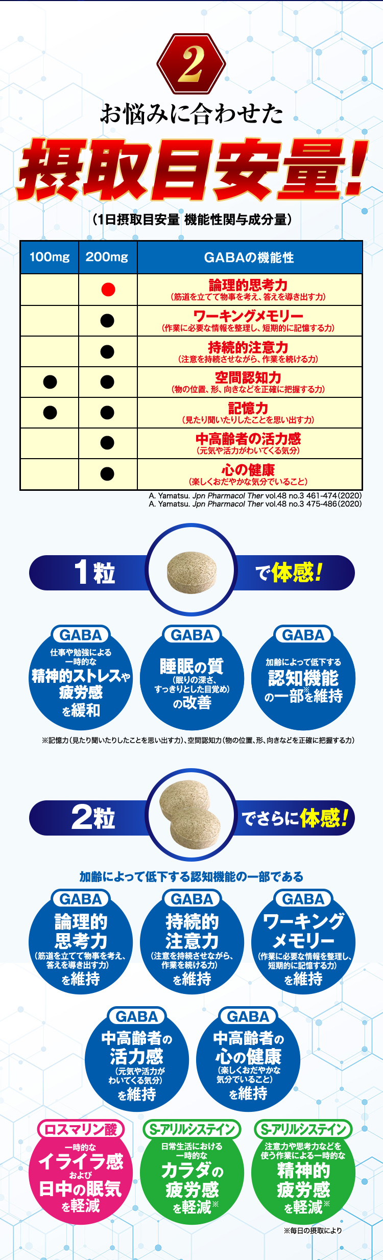 - 仕事や勉強による一時的な精神的ストレスや疲労感、睡眠の質、認知機能の一部である記憶力・空間認知力の低下が気になる方は、1日あたり1粒を目安にお召し上がりください。一時的なイライラ感や日中の眠気が気になる方、一時的なカラダの疲労感、注意力や思考力などを使う作業による一時的な精神的疲労感が気になる方、認知機能の一部である論理的思考力・持続的注意力・ワーキングメモリー、活力感、 心の健康が気になる方は、1日あたり2粒を目安にお召し上がりください。