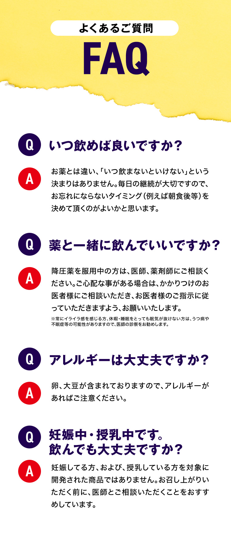 - 万一、体質などによりお体に合わない場合は、ご使用を中止してください。アレルギーのある方は、ご使用前に原材料をよくご確認ください。常にイライラ感を感じる方、休暇・睡眠をとっても眠気が抜けない方は、うつ病や不眠症等の可能性がありますので、医師の診察をお勧めします。GABAは理論的に降圧薬との併用で低血圧を引き起こす可能性があるため、降圧薬を服用している方は医師、薬剤師に、 摂取について相談してください。GABAは過剰摂取による健康被害は報告されておりませんが、過剰摂取により疾病が治癒したり、より健康が増進するものではありません。1日摂取目安量をお守りください。